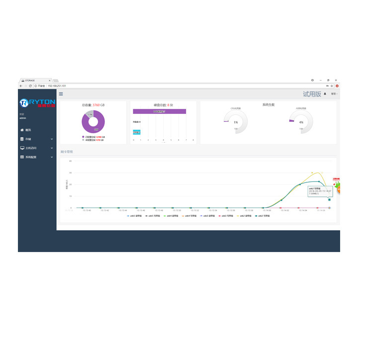 瑞腾存储软件是基于银河麒麟系统开发,为国产飞腾平台的加固式携行存储阵列产品深度定制的存储软件,具有完全自主知识产权。用户可以通过Web Browser操作GUI界面进行存储资源的轻松划分和配置,包括RAID 级别设定,逻辑单元划分,分配逻辑单元。该软件通过实时显示硬盘总容量、硬盘个数、系统负载等当前状态,帮助客户识别并预见计算机磁盘存储系统组件的实时瓶颈。